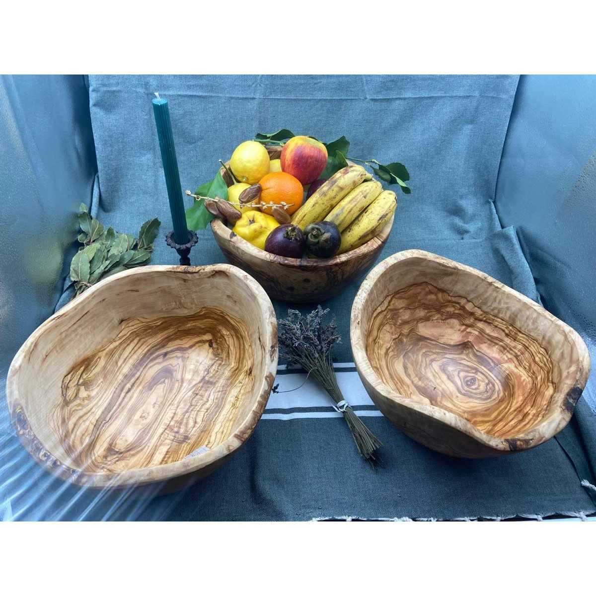 Discover the rustic elegance of our round olive wood salad bowl. Each piece is unique, offering natural wood tones that make it a special addition to your kitchen or dining room.